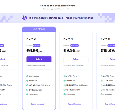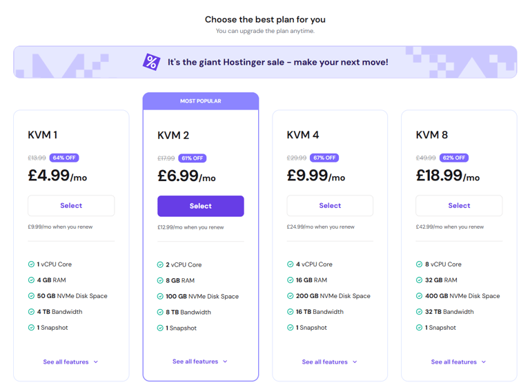 1. Select a Plan: Go to Hostinger and choose the KVM2 plan.