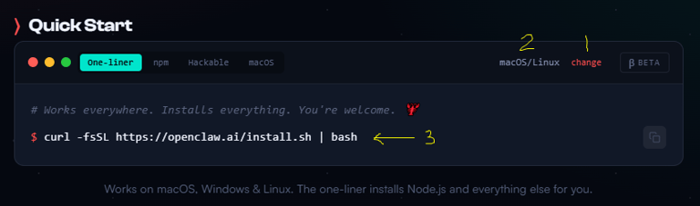 2. Run the Installer: Copy the oneliner command from the OpenClaw website and paste it into the terminal.