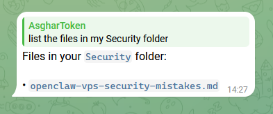 Earlier I asked assistant, create a folder called "Security" and do a web search to find the most common security mistakes people make when installing OpenClaw on VPS. I also asked my assistant to save the findings as an .md file. The means that the contents of that file is now in OpenClaw's memory. The followings are based on the recommendation in that file: