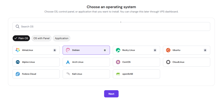 3. Choose Operating System: Select Plain Operating System and choose Debian 13 (Ubuntu is also acceptable).