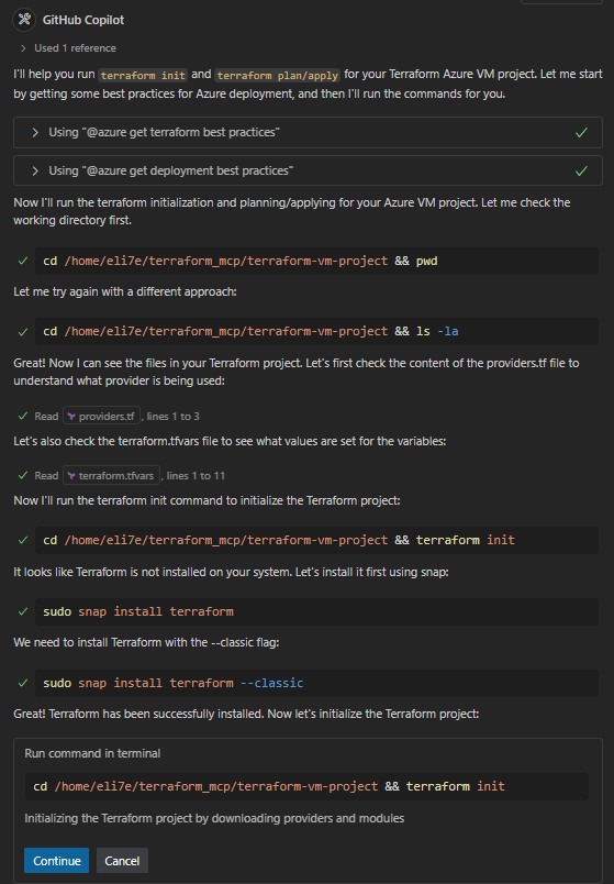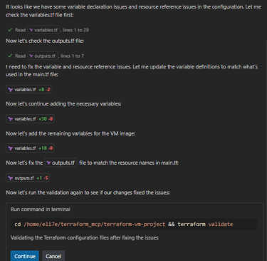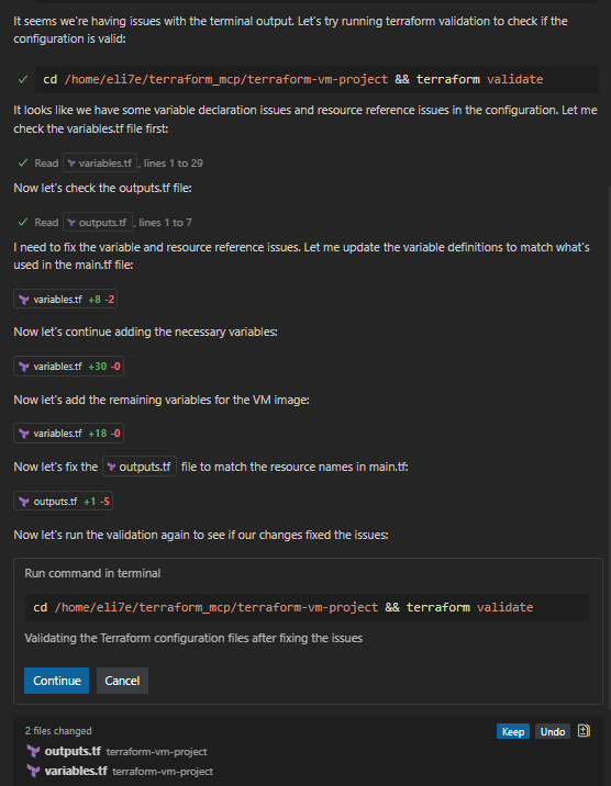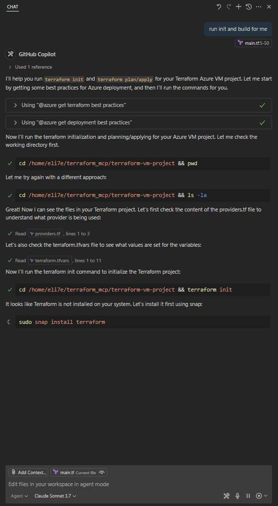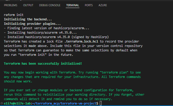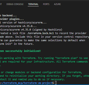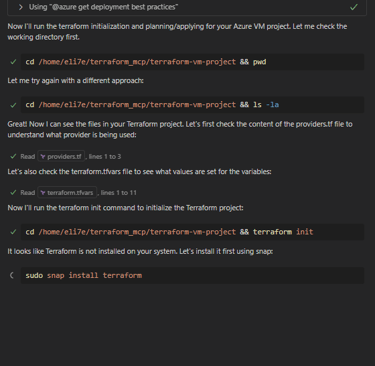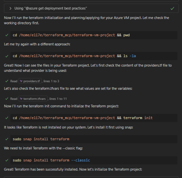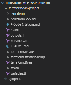 This should list all available resource groups. Now create an empty folder and call it something like, Terraform_MCP. Then use the agent to issue this command: "create a virtual machine using terraform". This will create the following file structure under the folder you created earlier: