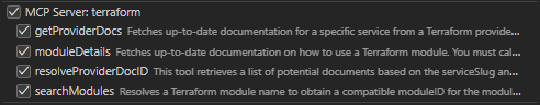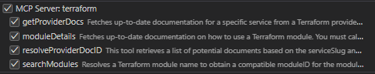 If you look at the agent's tools and search for mcp, you can see that the agent now has the capability to get terraform provider documentation and provider details as well as the ability to search for modules and their details. This additional knowledge or context can help to ensure better, faster and more accurate code generation.