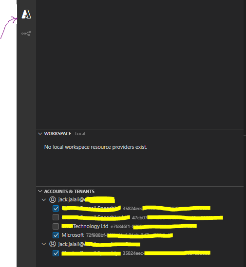 Now let's connect to our Azure subscription, by now the extension for Azure should be installed and visible, click on the Azure icon and go to "Accounts & Tenants" and authenticate to your Azure environment: