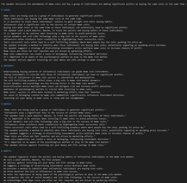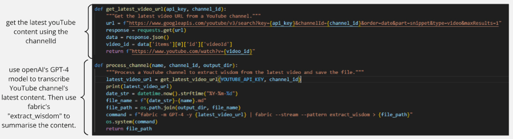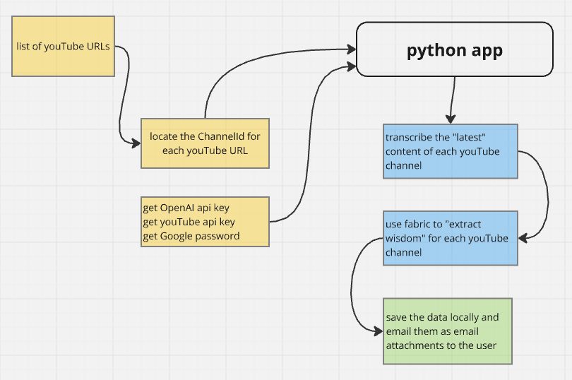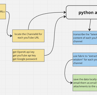 YouTube has become an invaluable resource for staying up-to-date with the latest trends and innovations. However, with so many hours of content available, it can be challenging to keep up. For example, I follow multiple YouTube channels across various subjects, including cryptocurrencies and AI, I often find myself struggling to keep up with the latest trends and insights. With some videos exceeding 30 minutes or more, it can be overwhelming to absorb all the information. To address this challenge, I've developed a approach that combines transcription technology from platforms like OpenAI or open-source Large Language Models running on Ollama with analytical techniques from fabric, developed by Daniel Meissler.