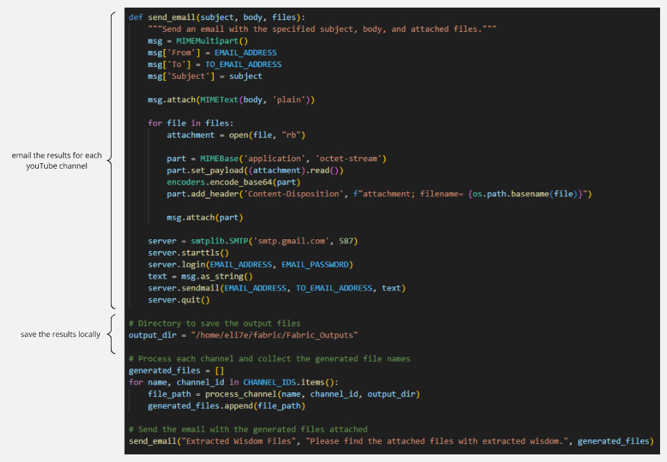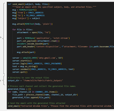 While installing fabric on a Linux operating system is straightforward, I made the process slightly more interesting by using WSL (Windows Subsystem for Linux) in this blog post. Additionally, not only I keep all the extracted Wisdoms locally, I also email the results as attachments after each run. Since the code runs under Linux, crontab is used to schedule daily execution of the code.