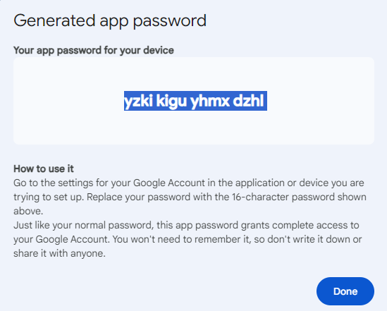 now this 16-character password can be used for the SMTP settings together with our gmail address.