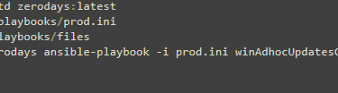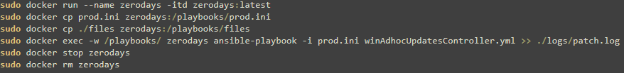 the patchZeroDays.sh shell file, when executed triggers the launch of a container called zerodays based on the docker image zerodays:latest. As part of this process, the script copies the ansible inventory file, prod.ini together with the contents of the files folder to the container. The container then executes an Ansible playbook (winAdhocUpdatesController.yml) to apply the latest patches, capturing all relevant output and logs in the patch.log file for future reference.