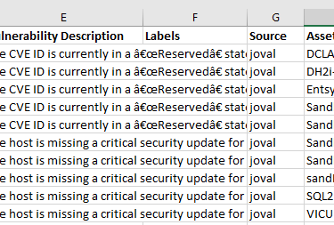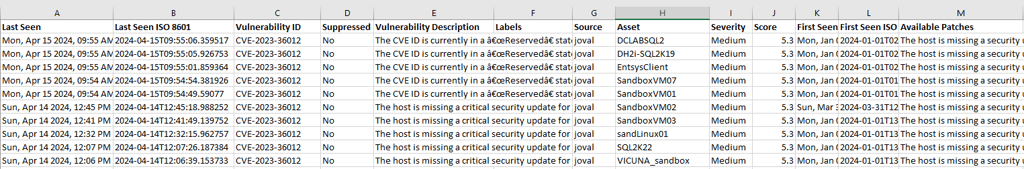 The InfoSec team regularly sends email notifications that include attachments detailing vulnerabilities within our virtualised infrastructure. Unfortunately, these attachments often contain unnecessary information, such as powered down or decommissioned VMs. An example of a typical attachment is shown below: