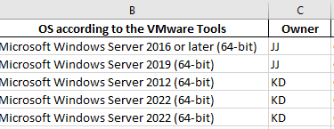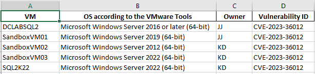However, I'm only interested in powered on VMs, their owners and the version operating system they are running and the Vulnerability ID. I need to know who the server owners are because they will be responsible to reboot their servers if necessary and verify that their applications are ok after the patches are applied. :