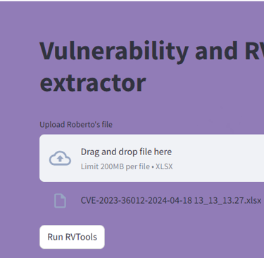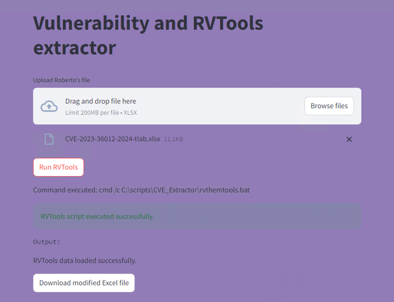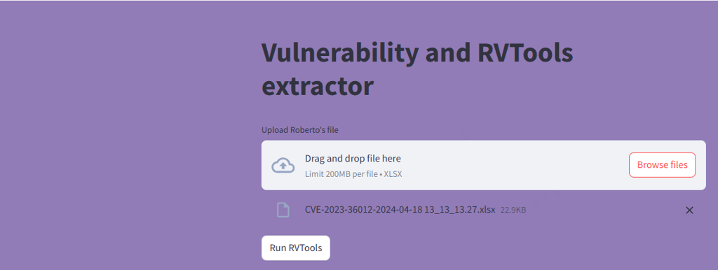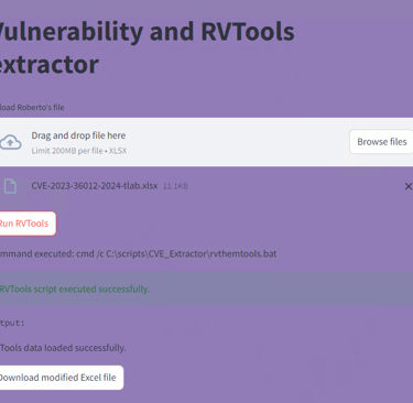 An application based on python and streamlit is developed that takes as input the "dirty" excel file sent by the infoSec team, then runs the RVTools and compare and extract only the relevant data as described above.