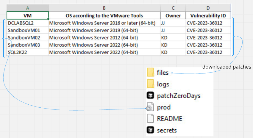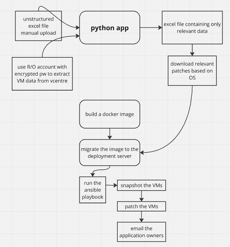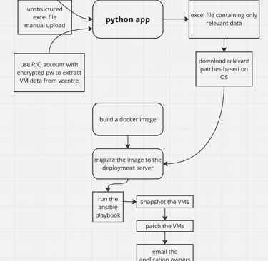 A python app using streamlit is developed to speed up extracting relevant information from a standard excel file. The information is then passed to a ansible running in a container to patch the vulnerable virtual machines.